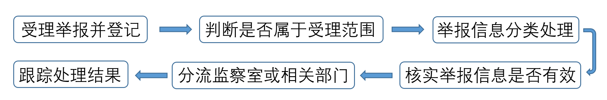 不同途徑的舉報線索由監(jiān)察中心實行專人管理、流轉(zhuǎn),處理程序如下: