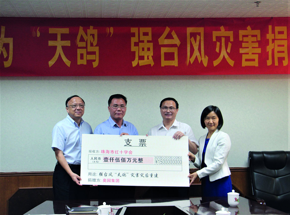 2017年,中國(guó)奧園集團(tuán)為珠海“天鴿”強(qiáng)臺(tái)風(fēng)災(zāi)后重建捐贈(zèng)1500萬(wàn)