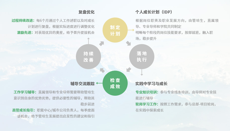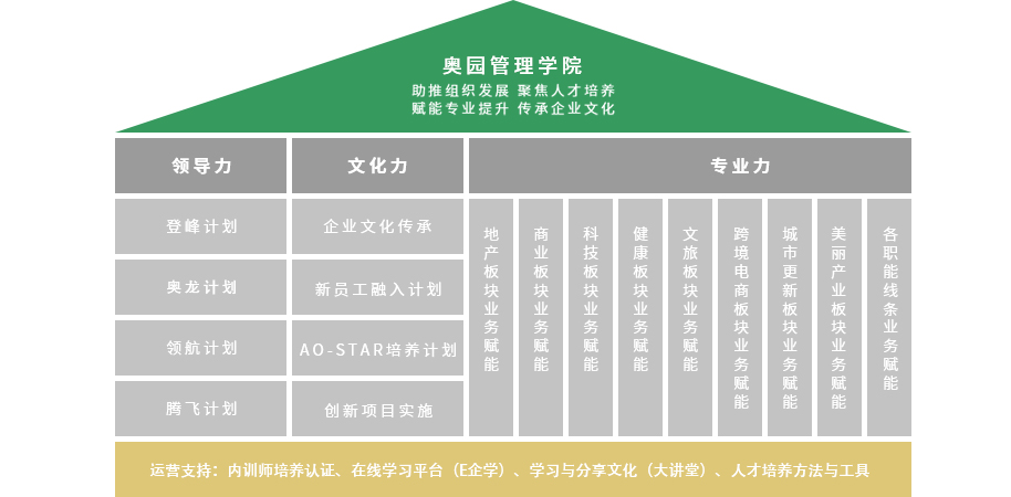 中國奧園集團一貫高度重視人才培養,集團管理學院覆蓋各層級員工開展人才培養項目,幫助員工持續成長及發展。學院已形成“三縱三橫”教學體系,致力打造領導力、文化力和專業力三大支柱能力培養體系,同時積極開展人才梯隊建設項目、業務培訓賦能項目、業界經驗交流項目三類培訓項目。從專業到管理,從學習到實踐,學院全方位地幫助員工提升知識、技能和素質,滿足員工職業發展所需,助力集團經營目標達成。
