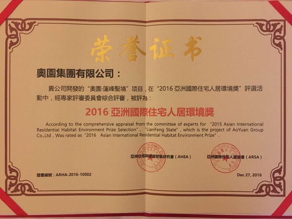 【奧園?蓮峰圣境】喜獲“2016亞洲國際住宅人居環境獎”