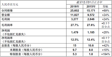 于2016年,奧園保持強(qiáng)勁的增長(zhǎng)勢(shì)頭,營(yíng)業(yè)額約為人民幣118.3億元,同比增長(zhǎng)約24%。毛利潤(rùn)增長(zhǎng)約24%至約人民幣32.8億元,毛利率約為27.7%,保持穩(wěn)定。凈利潤(rùn)(不包括匯兌損失)約為人民幣14.8億元,同比增長(zhǎng)約25%;凈利率約為12.5%。為慶祝奧園上市十周年及強(qiáng)勁銷(xiāo)售表現(xiàn),董事會(huì)建議派發(fā)末期股息每股人民幣9.7分及特別股息每股人民幣5.3分,總股息合共每股人民幣15分。