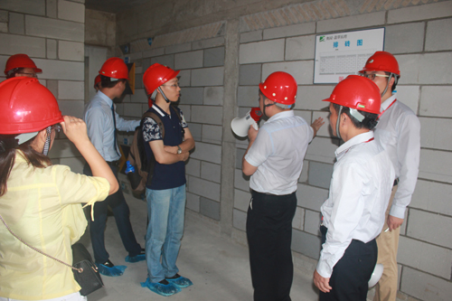 隨后,受邀業主、客戶在工程師及置業經理的帶領下進入工地,全程陪同為客戶詳細講解項目采用建筑材料、施工工序以及相關技術層面的問題。工程“樣板先行”,為了更直觀地展示建筑品質,此次活動特地開放了工法操作樣板區,這是工程施工的標準示范區,每一道工序都必須嚴格按照標準施工,定期組織施工方、監理及工程部門進行驗收,合格后方可進行下一道工序,確保施工質量符合要求。