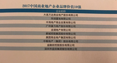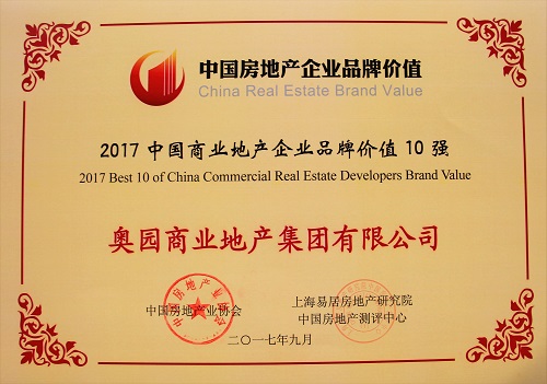 奧園商業(yè)地產(chǎn)集團(tuán)榮膺“2017中國商業(yè)地產(chǎn)企業(yè)品牌價(jià)值10強(qiáng)”