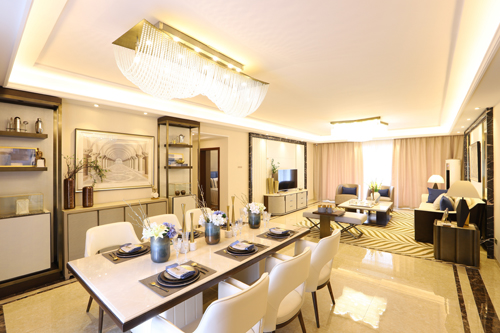 國慶期間開放的兩套精裝樣板房,戶型分別為170㎡和220㎡,為現代簡約風格。創新蝶形拼接戶型,戶戶視角分離,保證私密起居。其中220㎡四房兩廳三衛,擁85.7%高使用率,大格局客廳連餐廳,10米進深、5.4米開間,墅質享受。三套間設計,主臥享4.2米開間,7米進深,坐擁全景大陽臺,24小時美景熏陶。