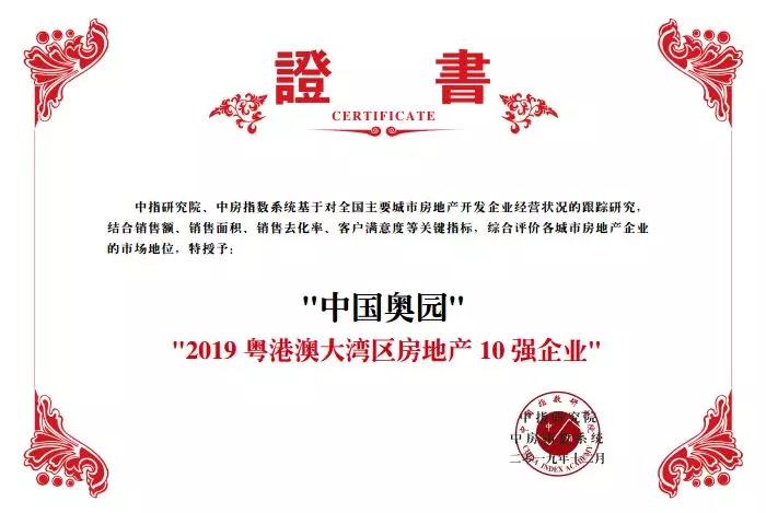 中國奧園憑借在粵港澳大灣區房地產市場的業績表現榮獲“2019粵港澳大灣區房地產10強企業”第8名。