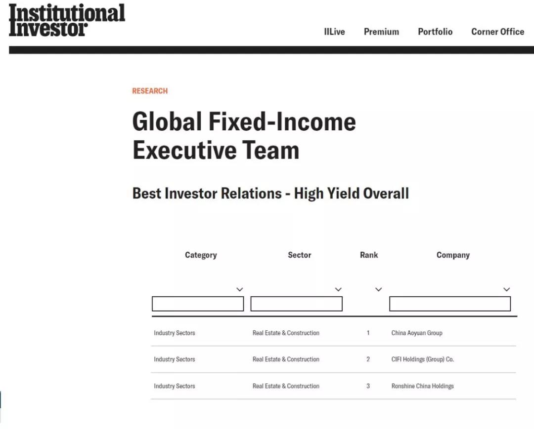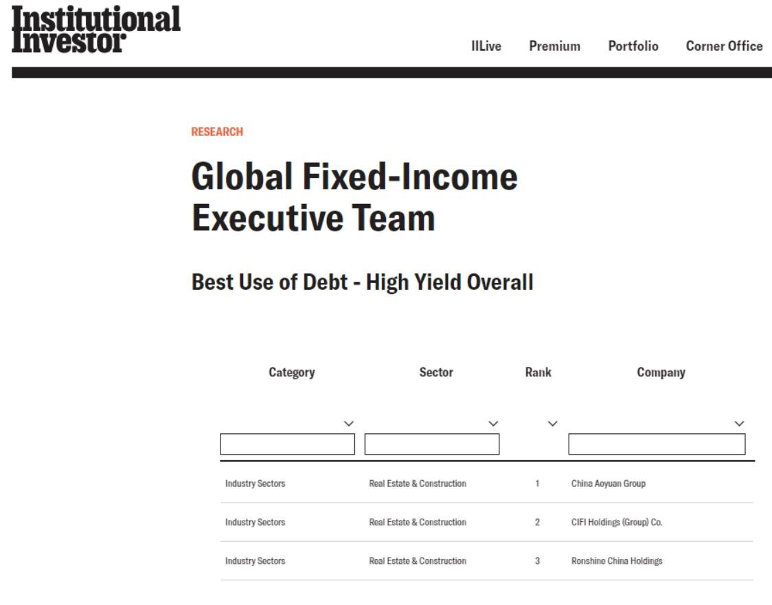 中國奧園榮膺《機構投資者》“2019全球最佳固定收益管理團隊”
