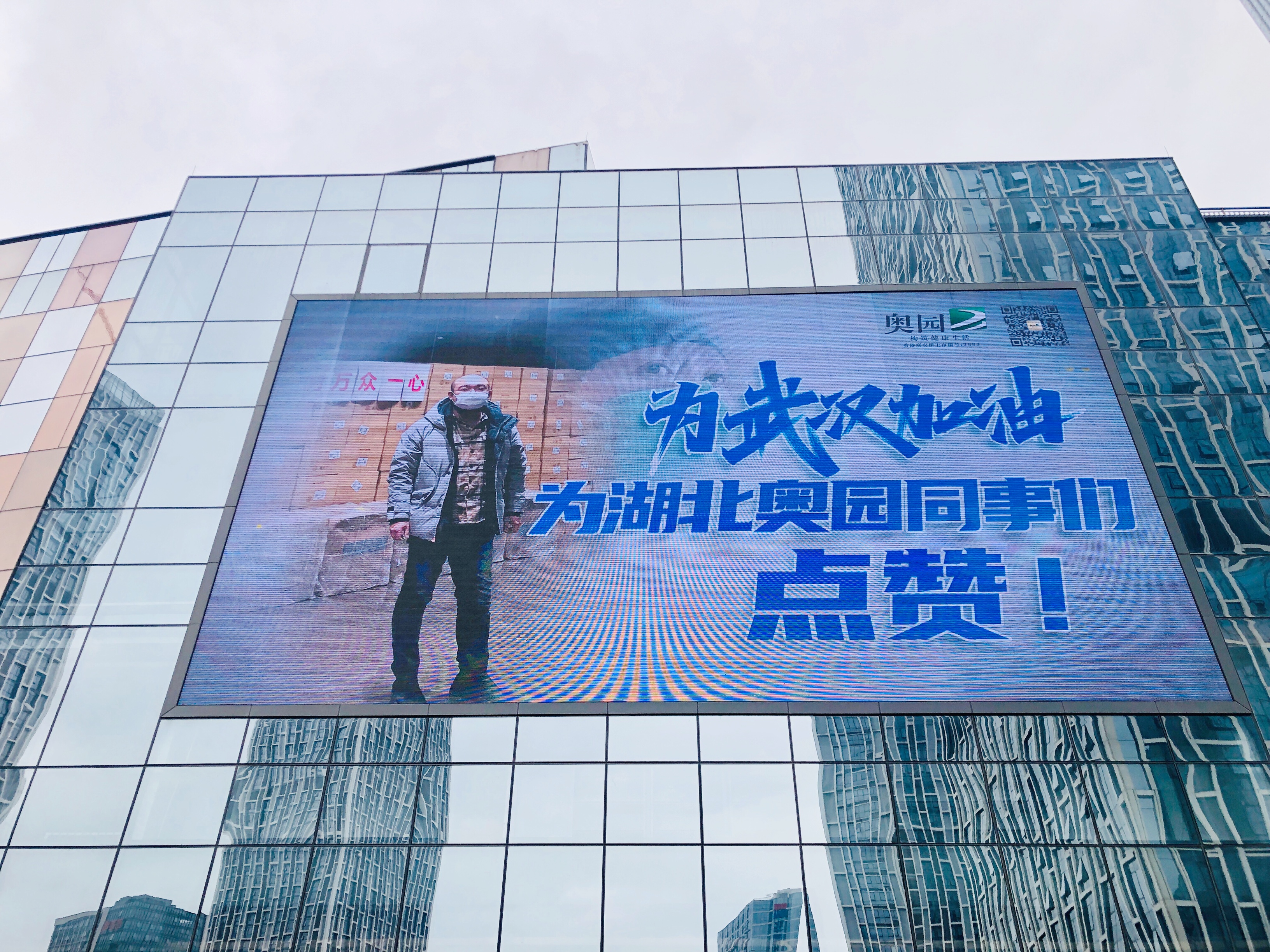 3月2日傍晚,全國各地21個奧園項目35塊LED大屏同一時間打出巨幅海報,為武漢加油,向“最美逆行者”致敬,給湖北奧園人點贊。