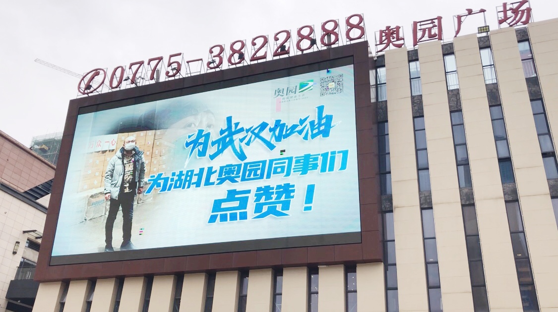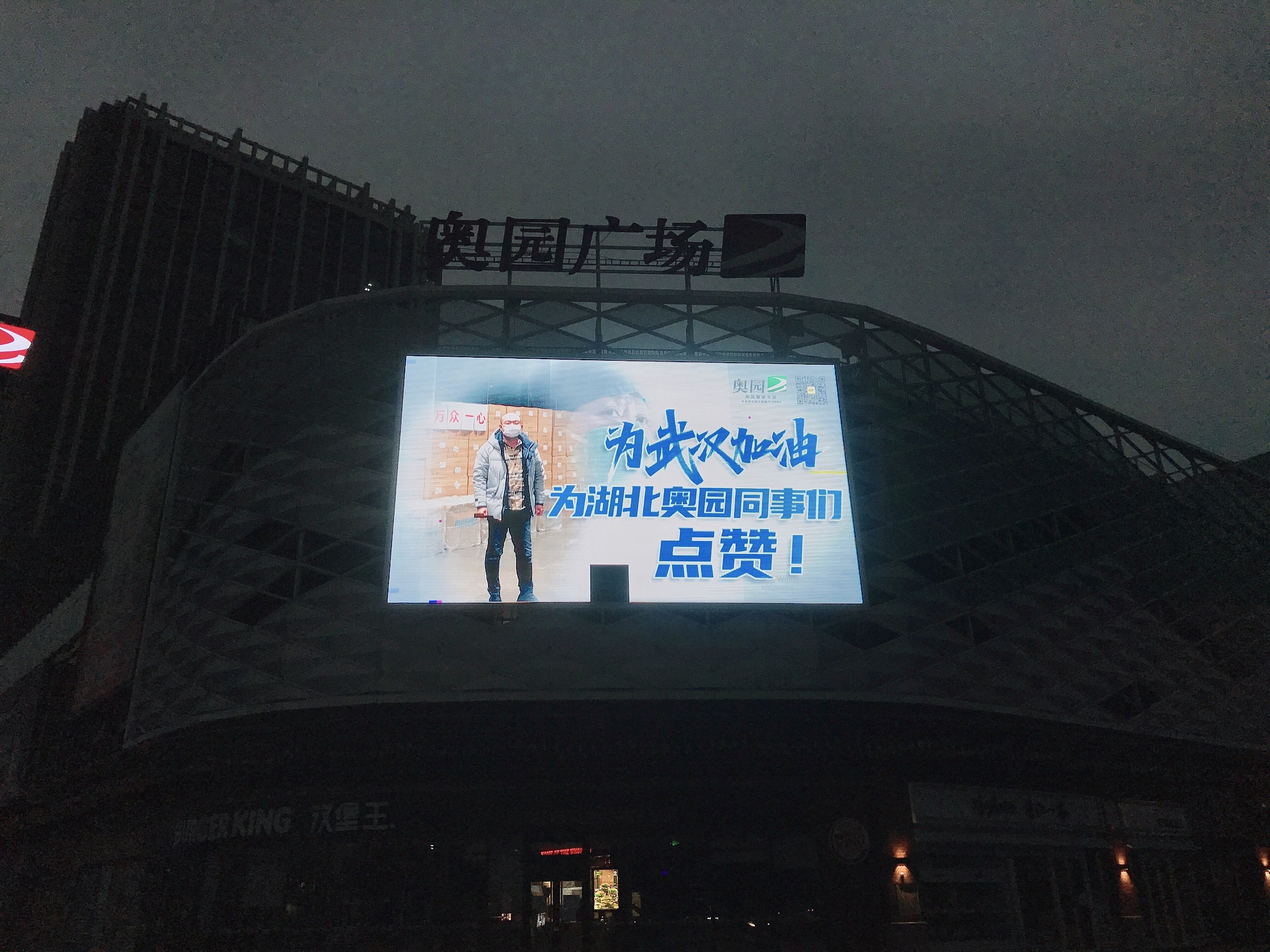 本次加油海報的聯(lián)動播放,覆蓋了中國奧園旗下多城多個業(yè)務板塊的各類場景,包括廣州奧園國際中心、江門奧園廣場、株洲奧園廣場、重慶盤龍奧園廣場等商管項目,惠州奧園領寓、南京天著尚居、鹽城奧園公園悅府等營銷場景以及中山泉林歡樂世界等文旅項目。21個項目主動參與,35塊LED大屏同時播放,展現(xiàn)出中國奧園上下一心為武漢、為前線員工加油打氣的熱情。