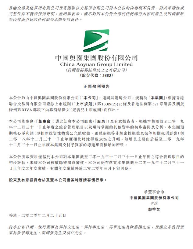 中國奧園:預計2019年核心凈利潤同比增幅逾50%