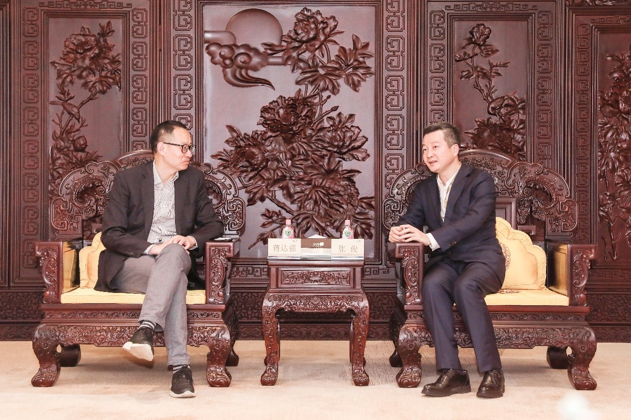 中國奧園集團執行董事、高級副總裁張俊(右)與弘陽集團總裁蔣達強(左)座談交流