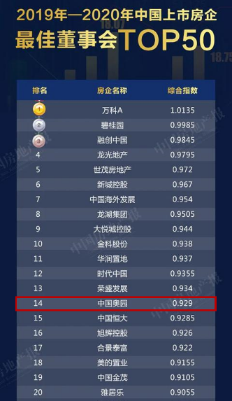 4月28日,中國房地產報發布“2019年—2020年中國上市房企董事會TOP50榜單”。憑借穩健的營運管理及財務狀況,中國奧園(3883.HK)在榜單中不斷攀升,榮列“2019年—2020年中國上市房企董事會”第14名,較上年大幅提升13位。