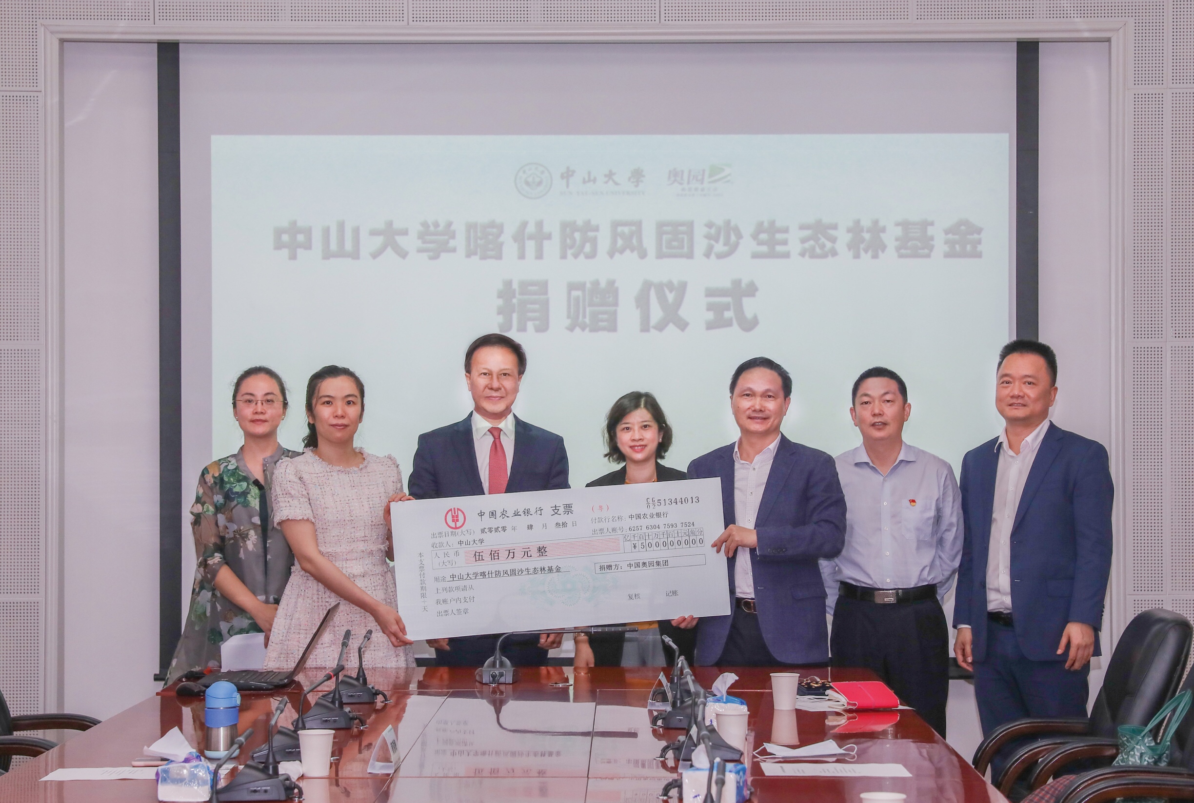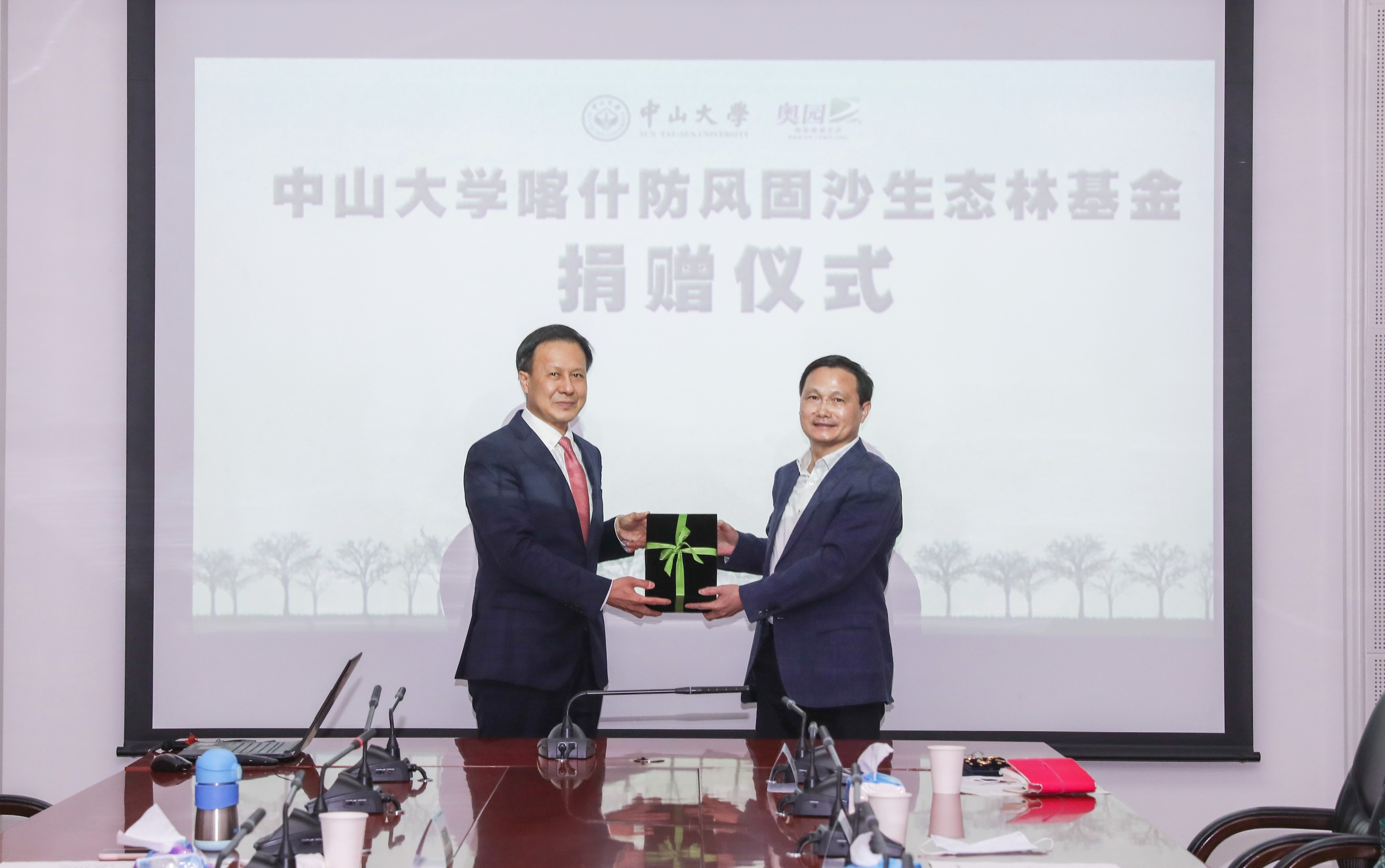 4月30日,中山大學喀什防風固沙生態林基金捐贈儀式在中山大學梁銶琚堂舉行。中國奧園集團黨委書記、總裁郭梓寧代表中國奧園向中山大學副校長、中大教育發展基金會副理事長肖海鵬教授轉交500萬元捐贈支票,專項用于促進新疆喀什地區沙洲綠化、生態產業扶貧等,助力實現生態改善和脫貧攻堅雙贏目標。