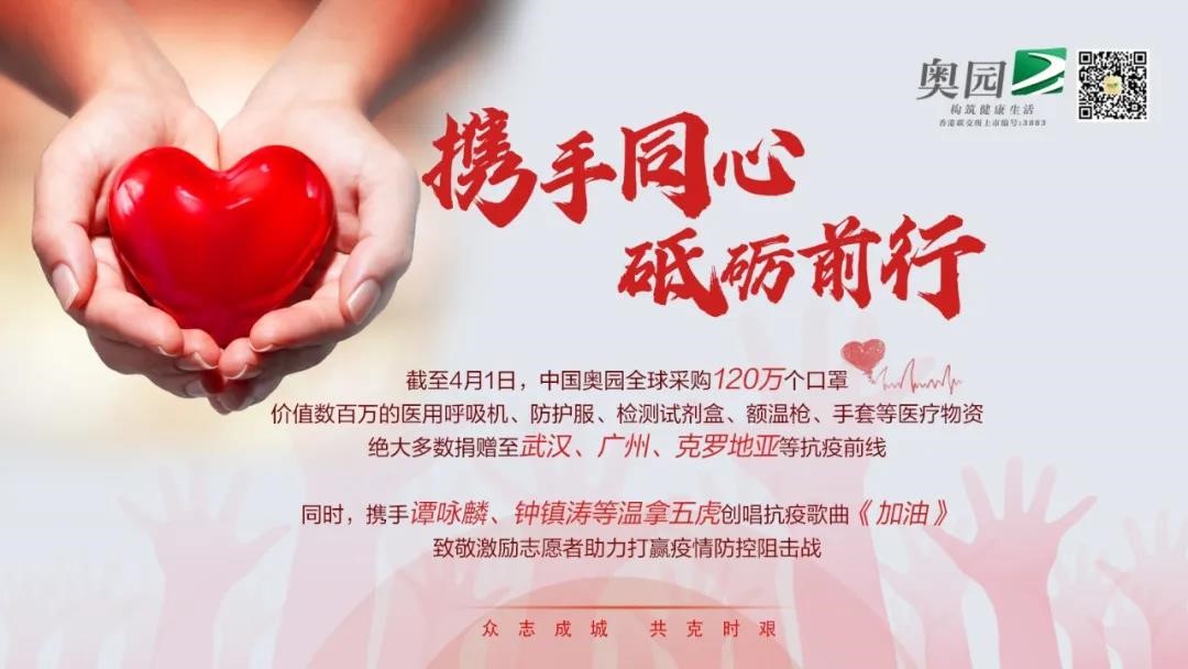 截至4月底,中國奧園已通過各渠道全球采購近120萬只N99、N95、FFP2、FFP1、一次性醫用等口罩,及相當數量的醫用呼吸機、防護服、檢測試劑盒、額溫槍、手套等醫療物資,其中絕大多數均捐贈至武漢、廣州、克羅地亞等抗疫前線。