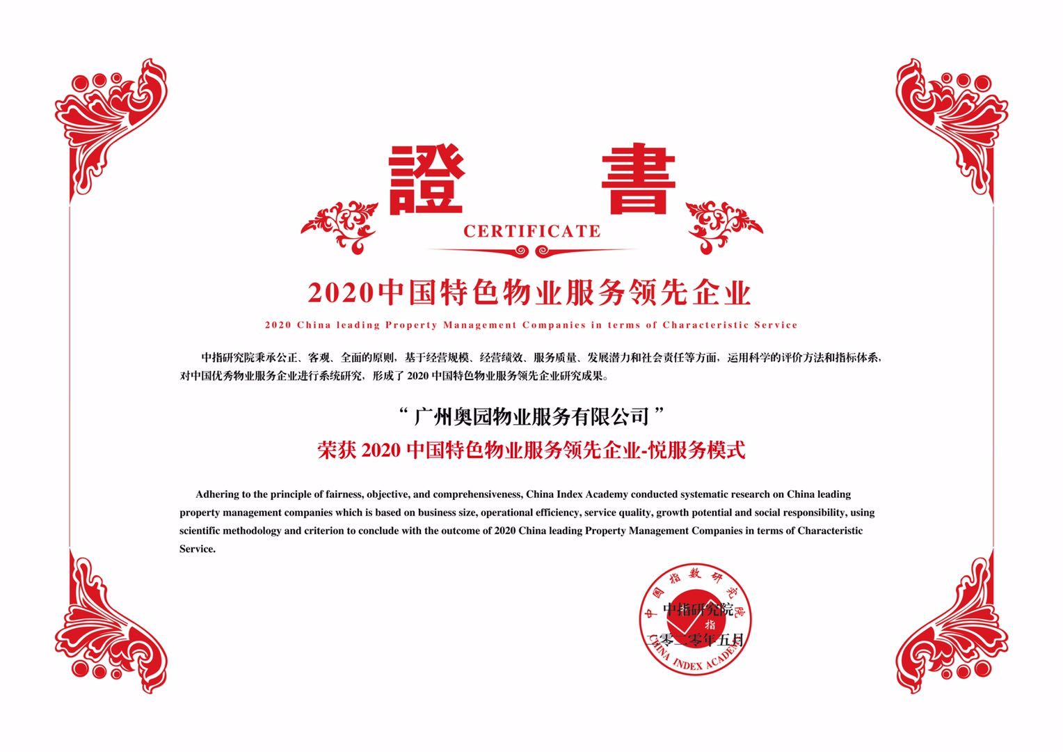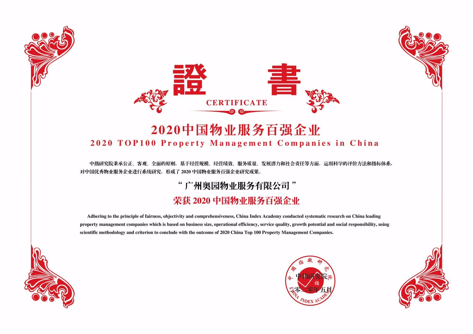 5月13日,國務院發展研究中心企業研究所、清華大學房地產研究所和中指研究院聯合發布2020中國房地產上市公司研究成果。中國奧園憑借在資本市場及投資價值管理的卓越表現,榮列“2020中國大陸在港上市房地產公司投資價值TOP10”第5名,“2020中國大陸在港上市房地產公司財務穩健性TOP10”第6名。同日,旗下奧園物業板塊蟬聯“2020中國物業服務百強企業”第15名,“2020中國物業服務年度社會責任感企業”“2020中國特色物業服務領先企業——悅服務模式”。