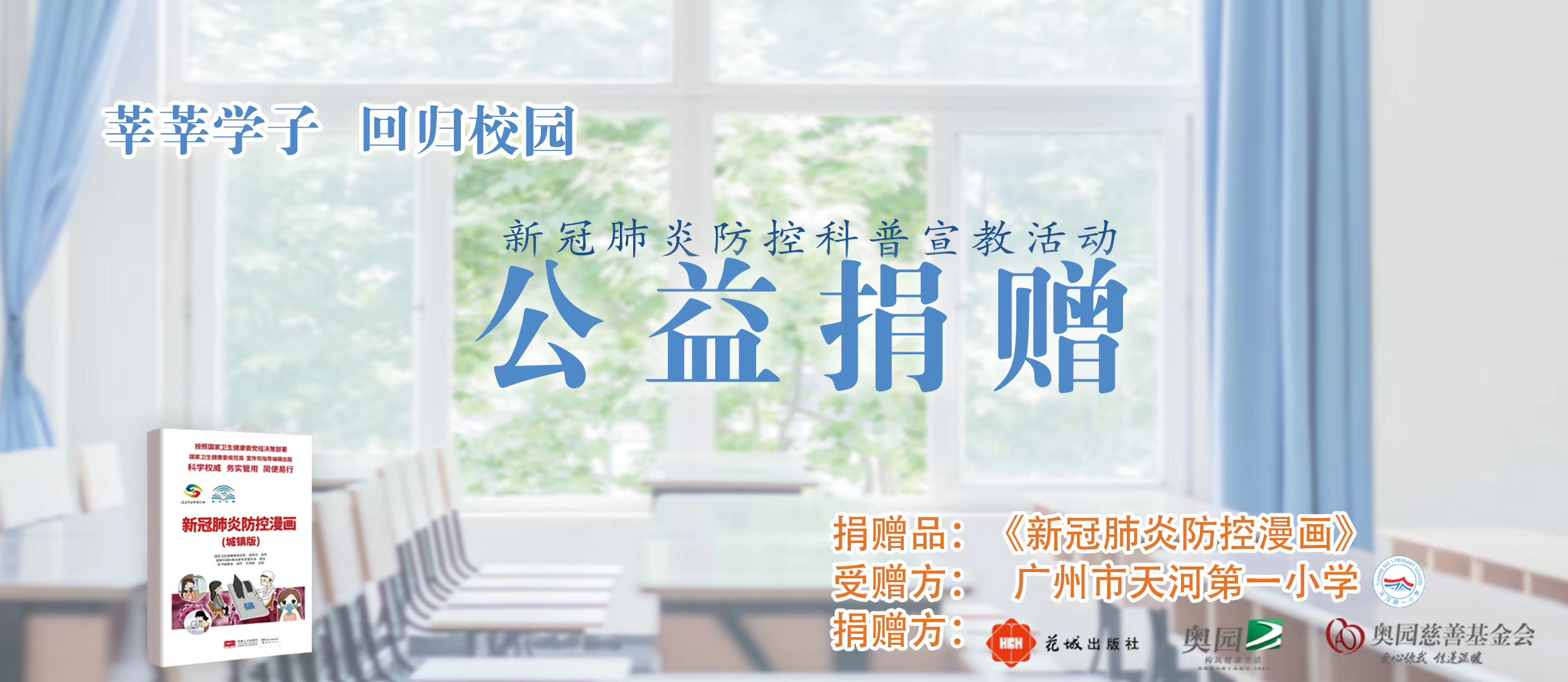 據(jù)捐贈方中國奧園集團負責人介紹,疫情得到控制并開學后,對青少年的精神和心理關懷尤為重要。鑒于此,奧園集團延續(xù)其抗疫期間的公益行動,聯(lián)手花城出版社經過多方聯(lián)系,向廣東省內的近70家中小學(含分校)捐贈共計5.2萬冊《新冠肺炎防控漫畫》,以保障校園安全,給孩子多一點提醒,讓父母和學校多一份安心。