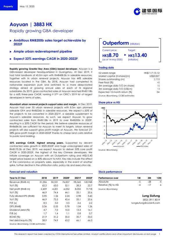 在研報中,建銀國際表示中國奧園為快速增長的大灣區(qū)發(fā)展商,已完成全國化布局,持續(xù)深耕重點區(qū)域,提高各區(qū)域的銷售金額,預期2022年合同銷售進入2,000億規(guī)模,2019至2022年復合增長率約20%。建銀國際認為,截至2019年底中國奧園的已售未結收入為人民幣1,705億元,2020至2022年核心盈利年復合增長率達33%,為同行最高。同時,中國奧園還擁有豐富城市更新項目資源,預計50%城市更新項目將于2020至2021年轉化土地儲備,補充可售資源,并認為城市更新項目會為中國奧園帶來更高利潤率。