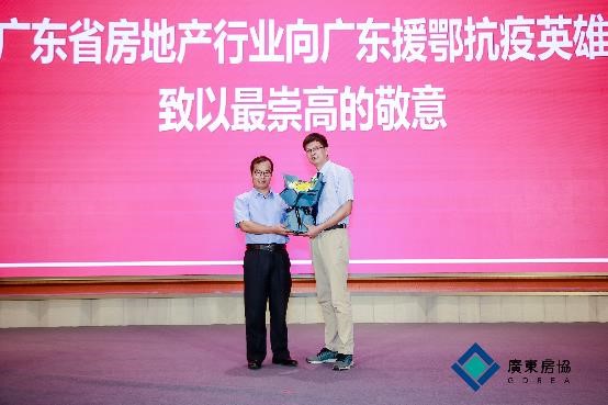 廣東省房地產協會會長王韶(左)向廣東省中醫院援鄂醫療隊員、芳村醫院重癥醫學科副主任醫師謝東平(右)獻花