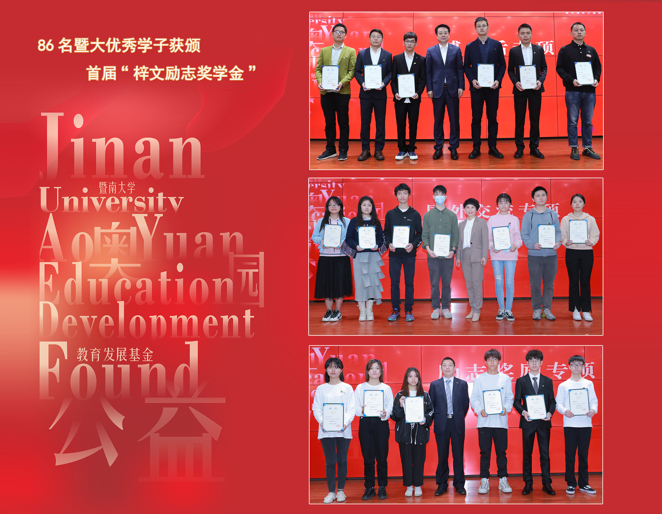 “梓文勵志獎學金”,是暨南大學校董和杰出校友、中國奧園集團董事會主席郭梓文捐資專項設立,旨在助力更多品學兼優的暨大學子接受教育,揚帆遠航。梓文勵志獎學金首期5年,每年獎金總額400萬元,包括“勵志獎勵專項”“國外交流專項”“博士后專項”三大部分,在家庭經濟困難學子助學、優秀學子交流訪學以及博士后科研等方面為暨大學子提供資金支持。當天,共86名暨南學子獲頒首屆“梓文勵志獎學金”。該獎學金是暨大迄今學生獎勵金額最高、覆蓋面最廣、管理最規范、影響力最深遠的社會獎助學金。