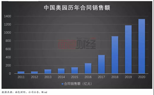 2020年,盡管有疫情的影響,中國奧園再次實現合同銷售額創下歷史新高,達到1330.1億元,同比增長13%。對比來看,2020年國內商品房銷售額約為17.36萬億元,同比增長8.7%。由此可見,中國奧園2020年合同銷售額的增速明顯快于行業整體增速。