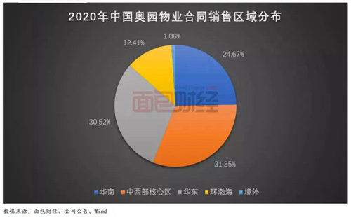 經過持續的積累,中國奧園目前已完成全國化布局。在公司2020年物業合同銷售區域分布中,華南、中西部核心區、華東的銷售額分別為328.10億元、417.00億元、405.90億元,分別占比24.67%、31.35%和30.52%,整體分布較為均勻,有助于提升公司抗風險能力。