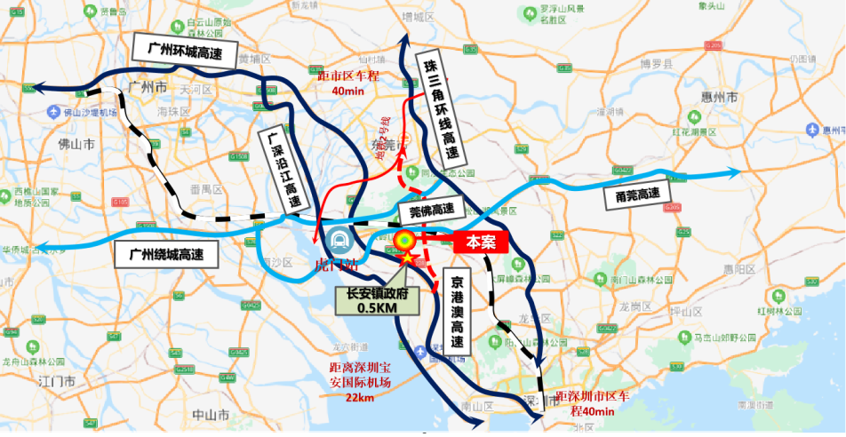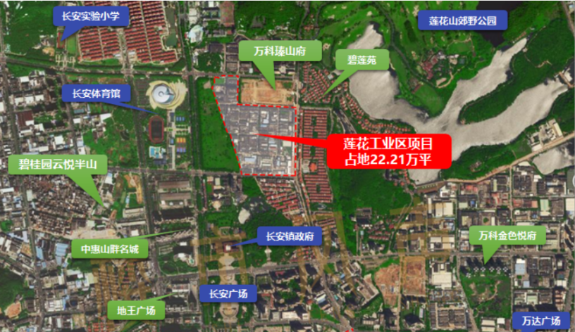 該項目位于東莞第一經濟強鎮長安中心區蓮花山豪宅版塊范圍內,緊鄰長安廣場、長安體育中心和大嶺山森林公園,距離長安鎮政府約1.5km,距離京港澳高速入口約2.5km,距離長安汽車站約2.7km,交通便利,地理位置十分優越,是長安環境最好、配套最完善版塊。項目占地面積22.8萬㎡,預計貨值170億,現狀以舊廠為主,拆遷難度較小,未來將打造為集居住、商業、研發等功能于一體的高品質項目。