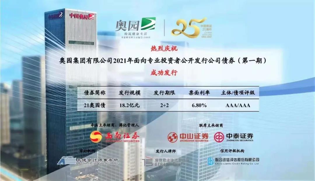 今年以來,奧園緊抓市場窗口期,通過境內(nèi)外多元渠道安排再融資,先后發(fā)出三筆合共7.38億美元優(yōu)先票據(jù),完成兩輪合共逾21億港元三年期境外銀團(tuán)貸款,并成功發(fā)行人民幣18.2億元公司債。同時,奧園一貫注重企業(yè)信用,已悉數(shù)贖回今年內(nèi)到期的公募境外優(yōu)先票據(jù),持續(xù)優(yōu)化債務(wù)結(jié)構(gòu)。