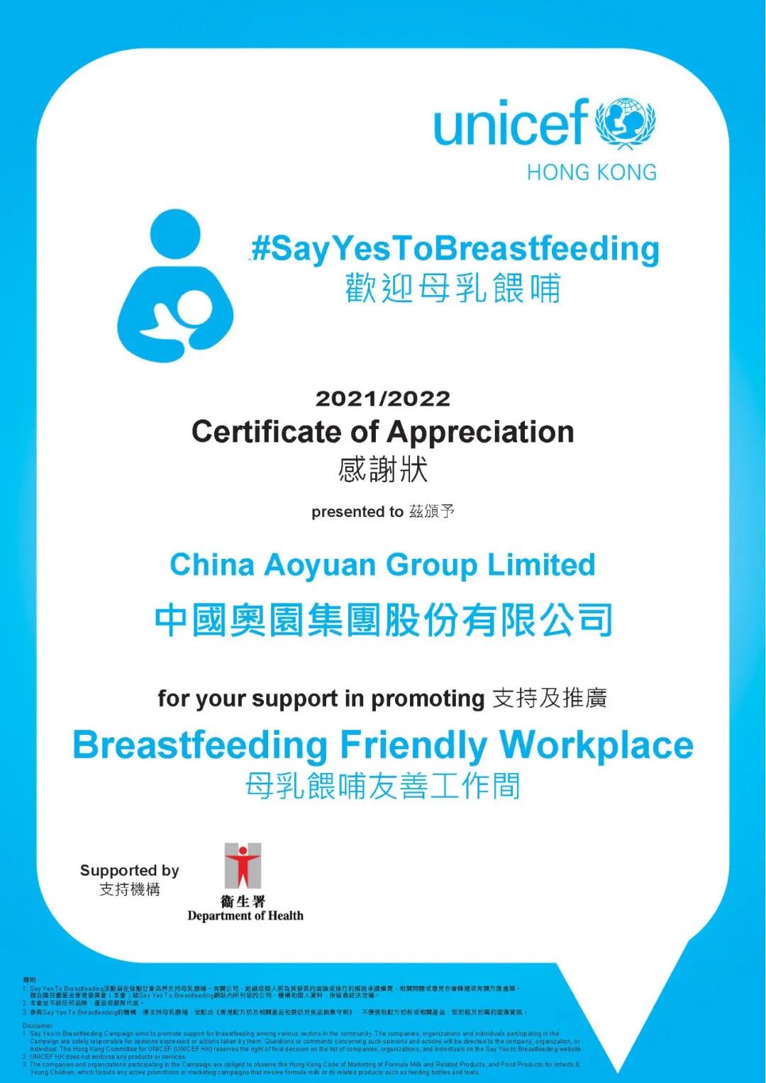 聯合國兒童基金香港委員會“母乳喂哺友善工作間”認證中國奧園一直積極支持聯合國可持續發展目標,維持良好的企業管治,致力推動多元共融、兩性平等、家庭友善、及唯才是用的企業文化。繼早前獲香港平等機會委員會頒發《種族多元共融雇主約章》首100+簽署機構及《平等機會雇主(家庭崗位平等)》認證,此次再獲多項嘉許既是對中國奧園一貫努力的認可,也顯示了中國奧園踐行企業責任的決心。中國奧園將再接再厲,持續推動讓不同背景的員工安心工作,盡展所長的工作環境及制度,為可持續、高質量的全面發展保駕護航。