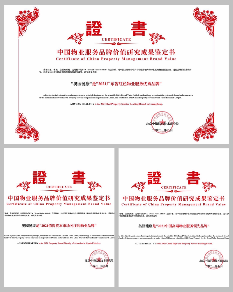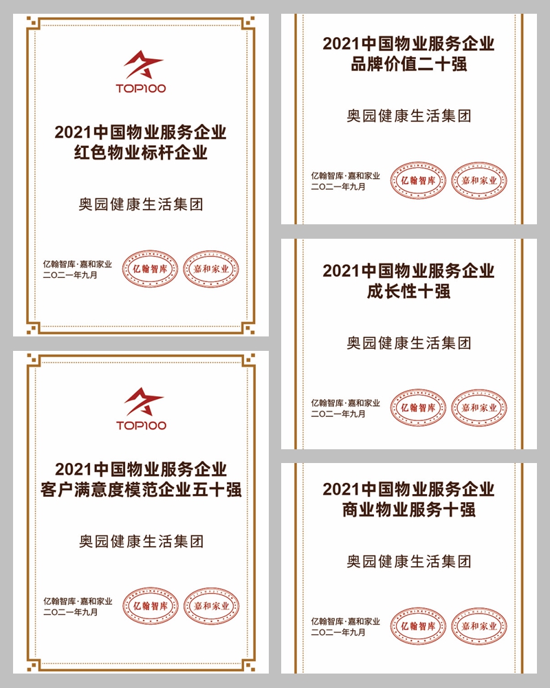 同日,中指研究院發(fā)布《2021中國房地產(chǎn)品牌價(jià)值研究報(bào)告》中,中國奧園攬獲“2021中國房地產(chǎn)品牌價(jià)值第12名”和“2021中國房地產(chǎn)產(chǎn)品力優(yōu)秀企業(yè)”獎(jiǎng)項(xiàng)。而奧園健康奪得“廣東省紅色物業(yè)服務(wù)優(yōu)秀品牌”“值得資本市場(chǎng)關(guān)注的物業(yè)品牌”“高端物業(yè)服務(wù)領(lǐng)先品牌”多項(xiàng)嘉獎(jiǎng)。