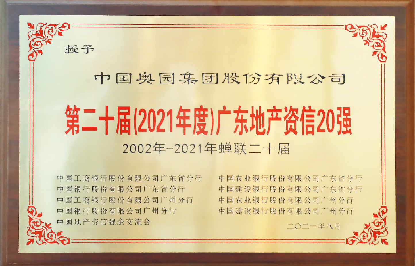 中國奧園獲評“第二十屆(2021年度)廣東地產資信20強”