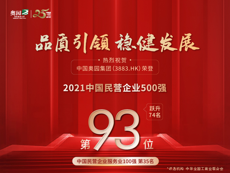 同日,全國工商聯正式發布2021年“中國民營企業500強”和“中國民營企業服務業100強”榜單。中國奧園躍居“2021年中國民營企業500強”第93名,排名較2020年勁升74位,連續四年上榜。同時,中國奧園還榮登“中國民營企業服務業100強”第35名。