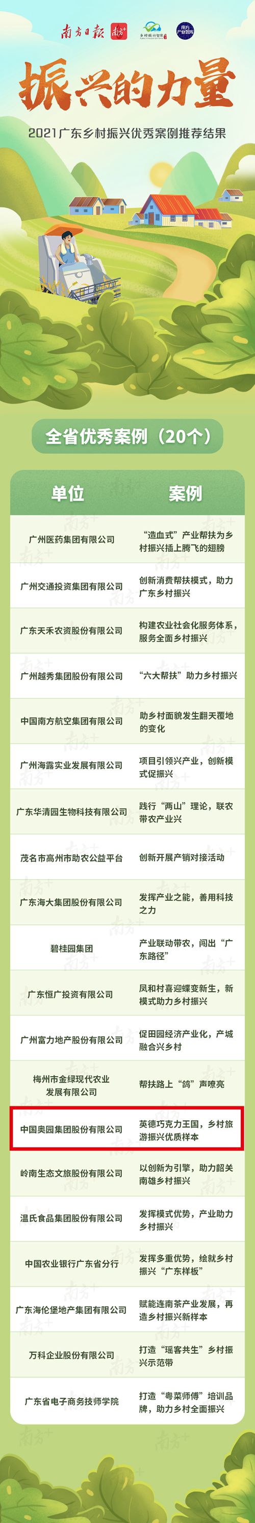11月25日,由南方報業傳媒集團主辦的“振興的力量——2021廣東鄉村振興優秀案例推介活動”評選結果正式出爐。中國奧園集團旗下文旅項目——奧園英德巧克力王國獲評“廣東鄉村振興優秀案例”。
