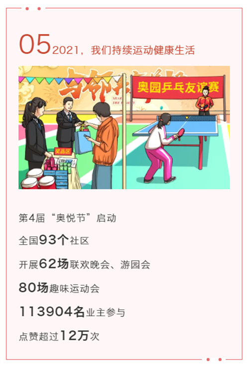 本屆奧悅節為期3個多月,覆蓋27座城市、93個社區,通過舉辦聯歡晚會、健康運動會、尊老敬老等活動服務業主,用實際行動兌現“構筑健康生活”的品牌理念。