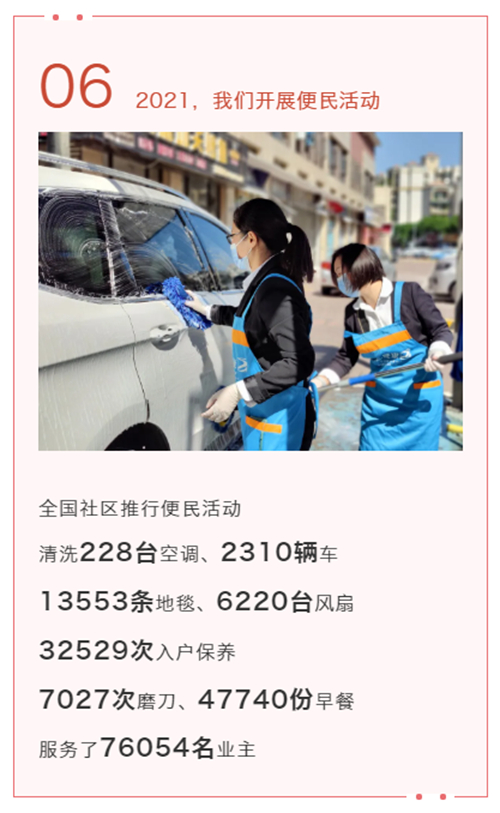 為全面提升服務品質,奧園在全國社區持續推行便民活動,清洗空調、車輛,入戶保養,送早餐上門等便民服務,全面改善業主居住體驗,有效提升業主滿意度。