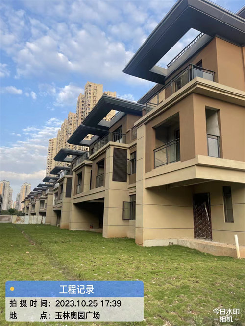 玉林奧園廣場(chǎng)別墅27#-29#、67#-68#幢主體結(jié)構(gòu)封頂,砌體、抹灰、鋁合金門窗、欄桿、室內(nèi)、外立面、園林、室外消防水管預(yù)埋、正式水、燃?xì)忸A(yù)埋、電表箱安裝已完成;消防栓完成50%;入戶線待施工;17#-18#、66#別墅道路硬化、綠化、正式水已完成。