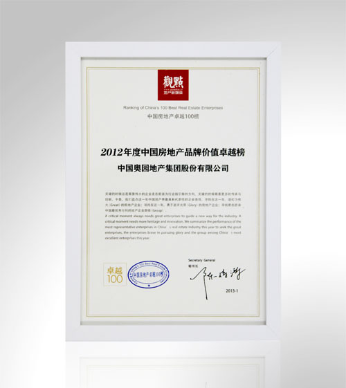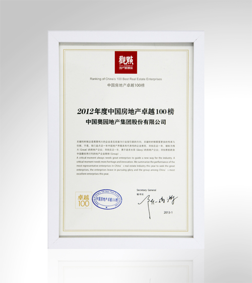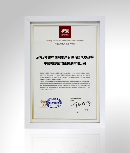 (2013年1月9日——廣州)在廣州舉行的“城市觀點論壇中國行2012年度論壇”中,觀點地產新媒體發布“2012年度中國房地產卓越100榜”,中國奧園地產集團榮獲“2012年度中國房地產卓越100榜”、“2012年度中國房地產品牌價值卓越榜”、“2012年度中國房地產管理與團隊卓越榜”三項大獎。