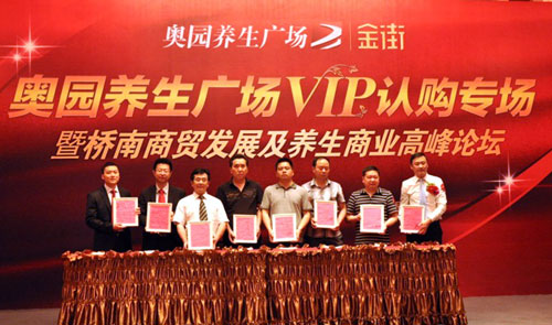 奧園養生廣場·金街是依托于大型城市養生綜合體的稀缺街鋪,統一規劃健康養生業態,打造高端專業的國際健康養生步行街。目前,金街已吸引了中華城市養生中心、華潤萬家等眾多品牌商家,寶芝林、寶貝新村(母嬰連鎖百貨)、好參來、建設銀行、美國本草、韓國高麗參、北京同仁堂等知名企業正在積極洽談。本次論壇上,奧園養生廣場與中華城市養生中心、奧園健康管理中心、華潤萬家、瑞士瑪麗婭菲女子SPA機構、愛嬰寶貝城和南國水鄉生態美食城六大主力商家簽訂了意向進駐協議。