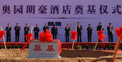(2011年10月17日——沈陽)世界頂級五星級酒店——奧園朗豪酒店奠基儀式在沈陽奧園會展廣場隆重舉行,中國奧園地產集團行政總裁郭梓寧先生、沈陽市蘇家屯區區委書記鄧福林、蘇家屯區區長李宏德等政府領導,以及朗廷酒店集團(中國)有限公司副總裁關銘煊先生等出席了本次奠基儀式。