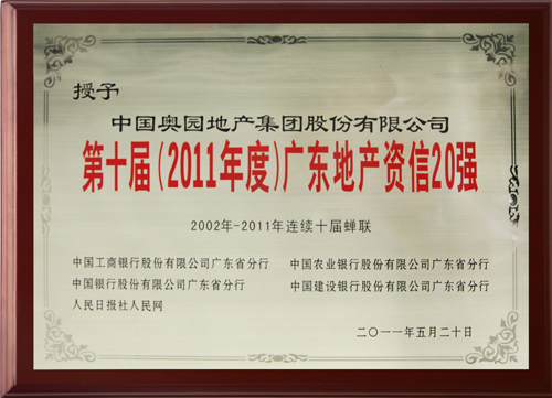 在5月20日廣州舉行的“和諧·共贏·發展”地產金融峰會暨“第十屆(2011年度)廣東地產資信20強”頒獎典禮上,奧園一舉摘得“廣東地產資信20強”和“十年卓越資信房企”兩項殊榮。該榮譽由中國工商銀行等四大國有商業銀行廣東省分行聯合中央權威媒體綜合評定,共同頒發。