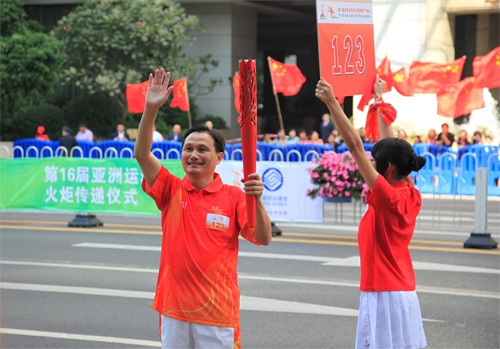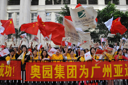 上午11時(shí),火炬手郭梓寧副主席出現(xiàn)在濱江東路段傳遞現(xiàn)場,奧園人忘記了初冬的寒冷和疲倦,大家熱情洋溢,揮旗鼓舞。當(dāng)前一名火炬手點(diǎn)燃郭副主席手中的火炬后,現(xiàn)場頓時(shí)一片歡騰,在四名亞運(yùn)會(huì)火炬護(hù)衛(wèi)的引導(dǎo)下,郭副主席自信地微笑著,一邊向前小跑一邊向市民揮手致敬,雖然只是短短100米的路程,但從他整齊的步伐里,我們看到了認(rèn)真與嚴(yán)謹(jǐn),看到了作為奧園人的驕傲與自豪!兩旁的奧園員工齊齊吶喊“廣州加油!亞運(yùn)加油!奧園加油!”,嘹亮的吶喊聲帶動(dòng)了現(xiàn)場幾萬名駐足觀看市民的歡呼喝彩,共同將氣氛推向高潮,火炬所到之處,歡呼聲和掌聲連綿不斷,體現(xiàn)了廣大市民對(duì)亞運(yùn)圣火的熱切期盼。