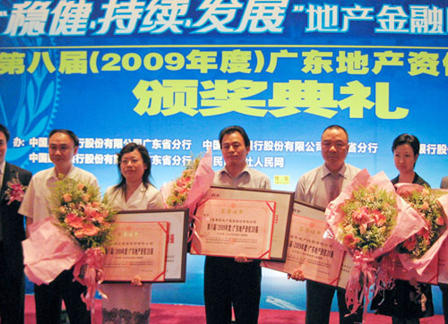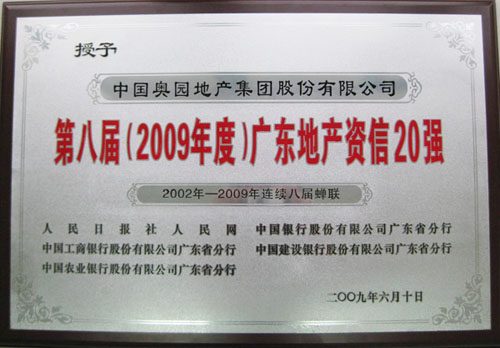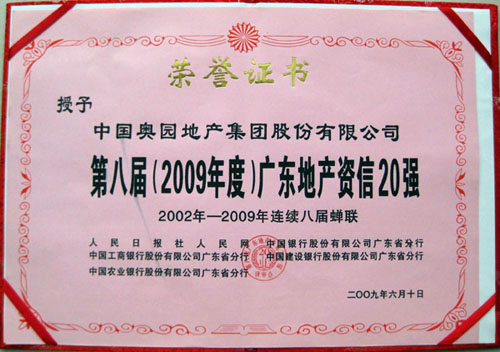 (2009年06月11日——廣州)中國奧園地產集團股份有限公司(香港股票編號:3883)榮獲由人民日報社人民網、中國銀行股份有限公司廣東省分行、中國工商銀行股份有限公司廣東省分行、中國建設銀行股份有限公司廣東省分行、中國農業銀行股份有限公司廣東省分行五大機構共同頒發的“第八屆(2009年度)廣東地產資信20強”稱號,成為連續八年蟬聯該項榮譽的四家大型房地產企業之一。