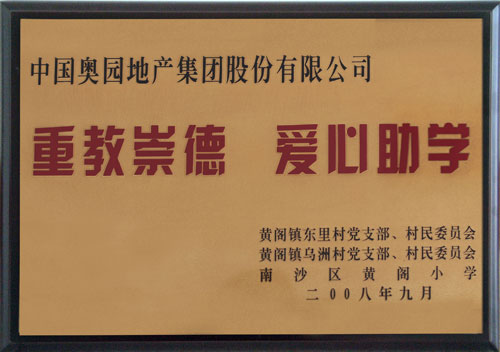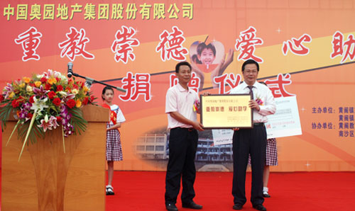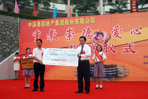 (2008年9月5日——廣州)2008年9月5日上午,廣州市南沙區(qū)黃閣小學彩旗招展,鑼鼓喧天,全校師生與各界來賓歡聚大操場。中國奧園地產集團股份有限公司“重教崇德,愛心助學”捐資100萬元的捐贈儀式在這里隆重舉行。這是奧園集團繼今年5月份向四川地震災區(qū)捐款330多萬元之后的又一次重大捐獻活動。