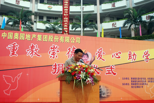 郭梓寧表示,中共中央總書記胡錦濤指出“教育是民族振興的基石”,今天奧園集團捐資100萬元只是盡了企業(yè)公民的責任,今后還將為家鄉(xiāng)的教育、慈善事業(yè)做出更大貢獻。