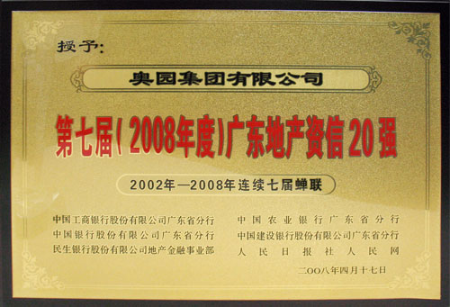 (2008年04月17日—廣州)中國奧園地產集團股份有限公司(股票編號:3883)榮獲由工商銀行、農業銀行、中國銀行、建設銀行、民生銀行五大金融機構頒發的“第七屆(2008年度)廣東地產資信20強”稱號,成為連續七年蟬聯該項榮譽的四家大型房地產企業之一,同時,中國奧園地產集團董事局主席郭梓文先生個人亦榮獲由舉辦方授予的“卓越資信”殊榮。