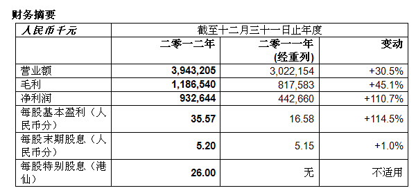 營業額及凈利潤分別大幅增加30.5%及110.7%至人民幣39.4億元及9.3億元