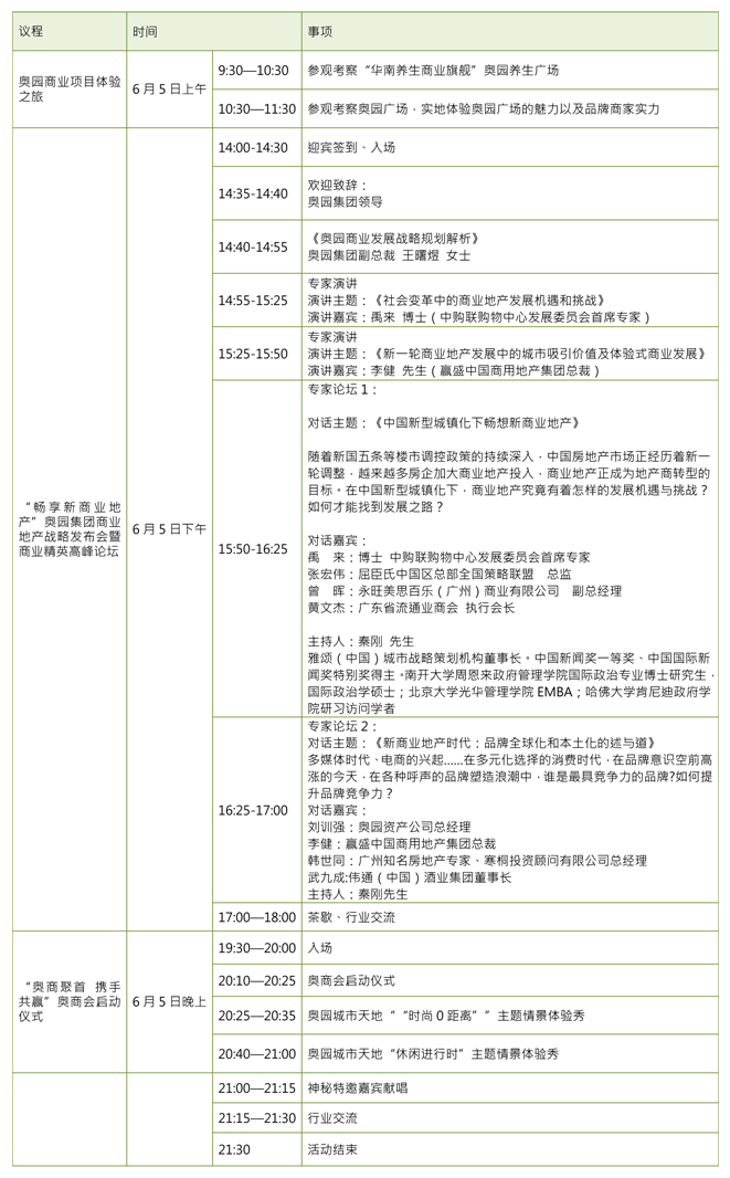奧園集團(tuán)專注于住宅和商業(yè)地產(chǎn)的雙線開發(fā),作為國(guó)內(nèi)商業(yè)地產(chǎn)開發(fā)的后來者,在奧園近年開發(fā)的項(xiàng)目中,無論是奧園廣場(chǎng)的“O-STYLE”理念,還是沈陽奧園會(huì)展廣場(chǎng)和會(huì)展經(jīng)濟(jì)的融合,以及奧園城市天地對(duì)休閑、娛樂、文化等元素的整合,處處彰顯出奧園商業(yè)品牌的獨(dú)特理念。奧園集團(tuán)將在此次峰會(huì)上發(fā)布集團(tuán)商業(yè)地產(chǎn)發(fā)展戰(zhàn)略,此外,作為奧園優(yōu)秀商家資源庫的載體——奧商會(huì)也將在此次活動(dòng)中盛大啟動(dòng)。