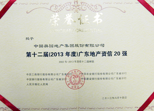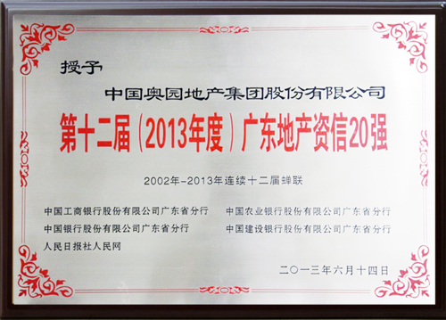 (2013年6月15日——廣州)憑借良好的企業信譽和穩健的財務狀況,中國奧園地產集團日前榮獲由工商銀行、農業銀行、建設銀行、中國銀行四大行廣東省分行及人民日報社人民網聯合舉辦評審的“第十二屆(2013年度)廣東地產資信20強”稱號,成為連續十二年蟬聯該項榮譽的四家大型廣東省房地產企業之一。