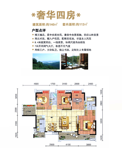 雄踞中央景觀中軸核心位置,瞰10萬畝山林和3公里純天然溪流,山、林、水、園四重無敵景觀,8米闊景休閑陽臺,