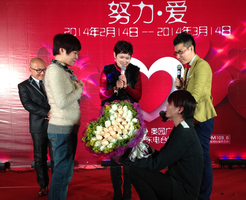 活動當天,由廣東電臺城市之聲多位靚聲主持人現場主持的“努力·愛”浪漫情人節活動吸引了約4萬人次參與,廣東南方衛視著名主持人“細龜”更是受到了觀眾的熱情追捧。現場不僅邀請到韓小薰等新生代歌手獻唱情歌,更設置了溫馨甜蜜的游戲環節,給情侶、夫妻和家庭成員之間搭起溝通和傳遞愛的橋梁。活動將近尾聲,突然有位觀眾找到工作人員尋求幫助,原本他看了情人節活動之后大有感觸,希望通過這個舞臺讓更多人一起來見證他們的神圣時刻,手捧大束玫瑰的王先生走上舞臺的那一刻,奧園廣場瞬間化身浪漫求婚現場。