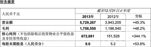 2013年,本公司成功取得優異的經營業績,營業額為人民幣57.29億元,同比增加45.3%。毛利增長48.2%至人民幣17.59億元,毛利率亦增加至30.7%。凈利潤達人民幣7.52億元,而核心純利(不包括除稅后投資物業公平值收益及非經常性收益)約為人民幣6.73億元,較2012年大幅增長約344.1%。每股基本盈利為人民幣27.42分。董事會擬派末期股息每股人民幣8.0分。