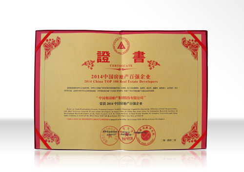 “2014中國房地產百強企業”證書